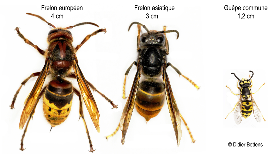 Le frelon asiatique diffère du frelon européen par ses pattes jaunes et son aspect général plus foncé. Il est de taille similaire, bien que légèrement plus petit. Ses nids sont également facilement reconnaissables. Il est actif du printemps à l’automne.