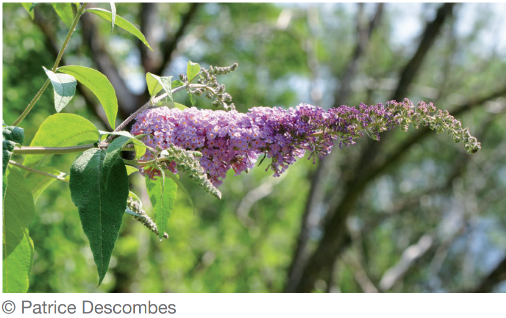 Le buddleia est un grand arbuste aux longues grappes de fleurs violettes, roses ou blanches, très fréquent dans les jardins et le long des routes. Sa période de floraison va de juin à octobre. En été, il attire de nombreux papillons, ce qui le rend facile à repérer.