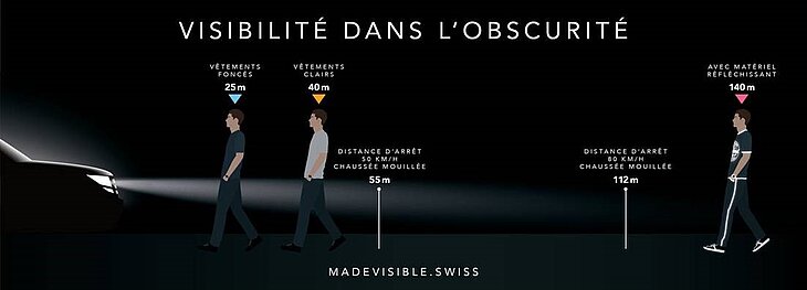 - Les personnes vêtues de couleurs sombres passent inaperçues ; porter des vêtements clairs ou avec des bandes réfléchissantes réduit ce risque, en multipliant par deux la distance à laquelle on est visible dans l'obscurité.