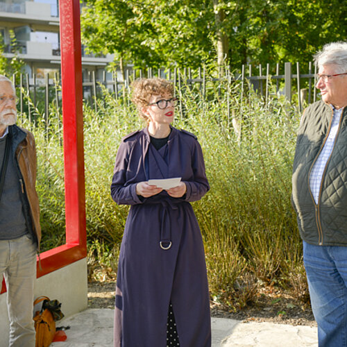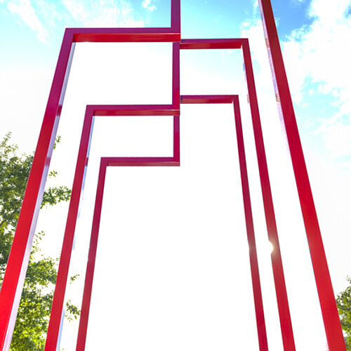 À la fois monumentale et minimale, visible de loin, intrigante et signalant l’entrée du Parc du Castrum, la sculpture Conjecture représente une subtile mise en valeur du passé archéologique enfoui.