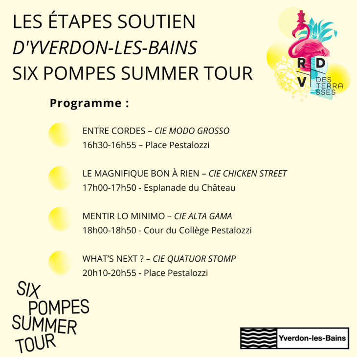 Ce jeudi 3 août, Yverdon-les-Bains accueille quatre spectacles prévus initialement dans le cadre du festival La Plage des Six Pompes, annulé en raison des intempéries qui se sont abattues sur La Chaux-de-Fonds.