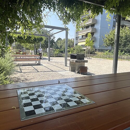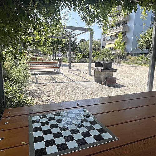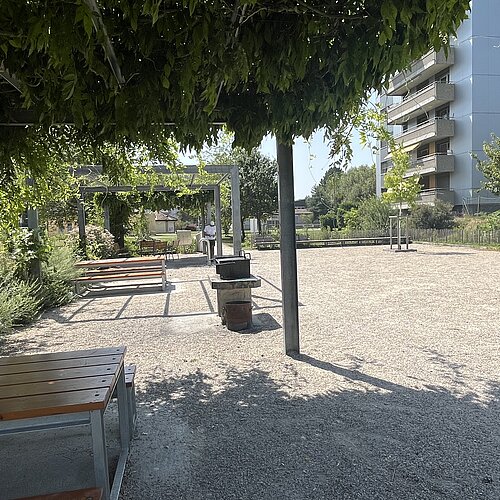 Tables, bancs, échiquier, terrains de pétanque, pergolas, terrain multisports, fontaine à boire, pergolas végétalisée, barbecue, poubelles