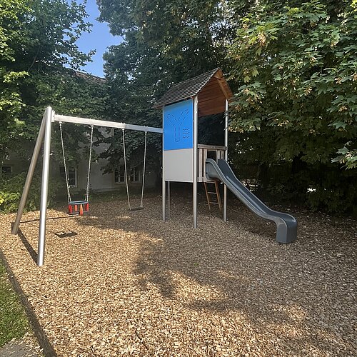 Tourniquet, chevaux sur ressort, balnçoire à bascule, balançoires, cabane avec toboggan
