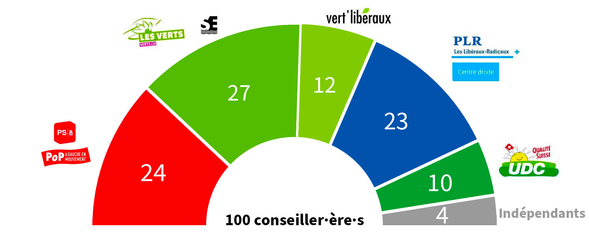 Les 100 sièges du Conseil communal sont répartis entre 6 groupes politiques :