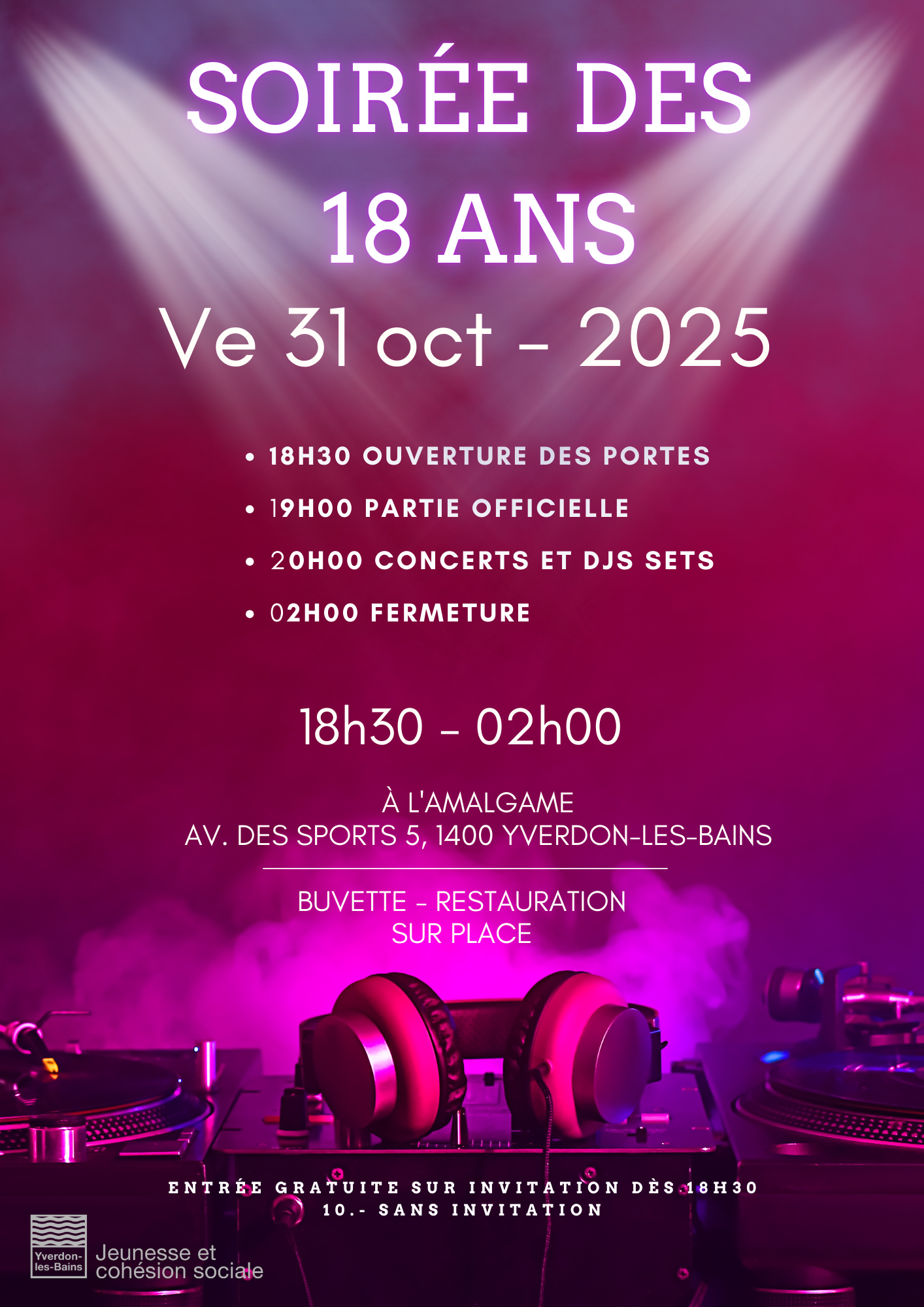 La réception pour les personnes nées en 2007 et atteignant leur majorité dans l'année en cours aura lieu le 31 octobre 2025 à proximité de l’Amalgame, à l’Avenue des Sports 5 à Yverdon-les-Bains.