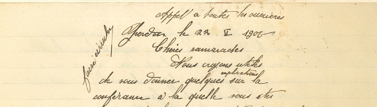 22 mai 1907 | Appel à toutes les ouvrières rédigé par Lucie Zingre et transmis au Syndic d’Yverdon |
